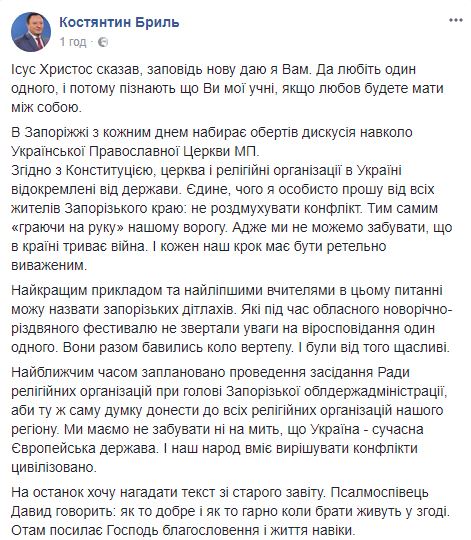 Глава Запорожской ОГА Константин Брыль на своей странице в Фейсбук прокомментировал скандал, который возник вокруг Запорожской епархии УПЦ МП.