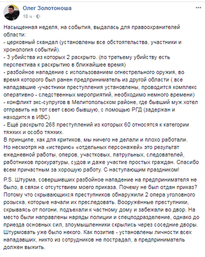 Об этом на своей странице в Фейсбук сообщил начальник Запорожского областного управления Нацполиции Олег Золотоноша.