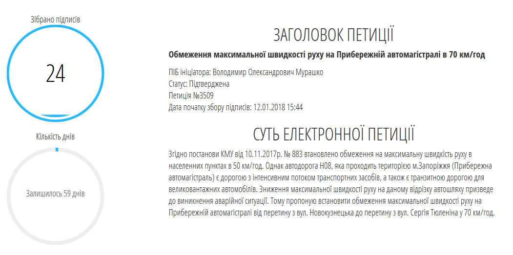 На запорожском сайте появилась петиция об изменении ограничения максимальной скорости движения на Набережной магистрали.