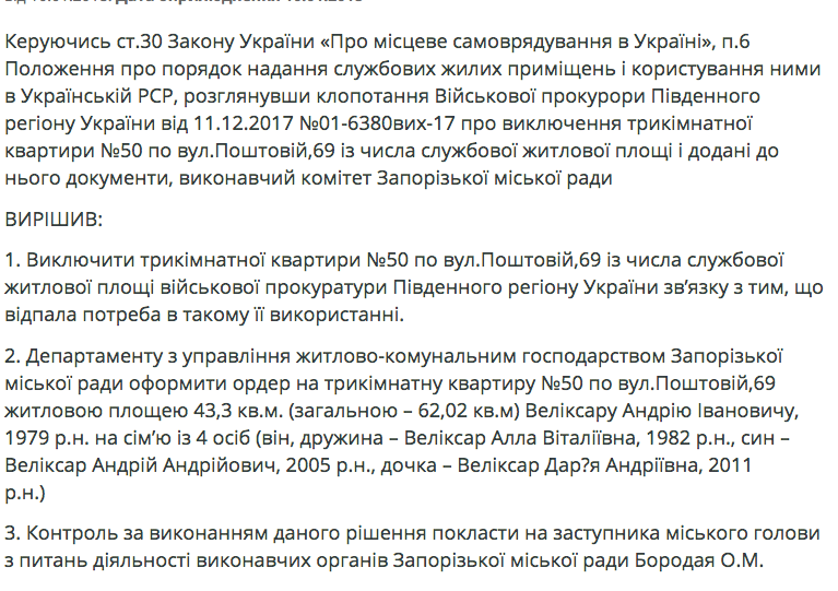 В проектах решения Запорожского исполкома от 10 января градоначальник Владимир Буряк дает письменное поручение Департаменту ЖКХ вывести квартиру из фонда служебного жилья и передать прокурорской семье.