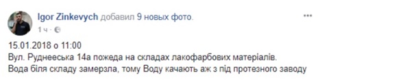"Ул. Рудненская, 14а, пожар на складах лакокрасочных материалов. Вода возле склада замерзла, поэтому ее качают из-под протезного завода", - написал он.
