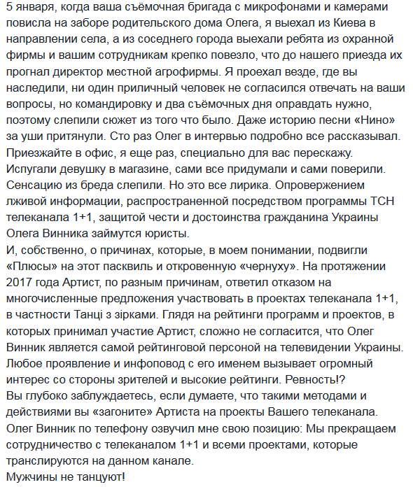 "В сюжете ТСН вы целенаправленно, бесцеремонно влезли в личную жизнь Артиста, оскорбили его честь и достоинство, поэтому мне придется расставить точки над "і".