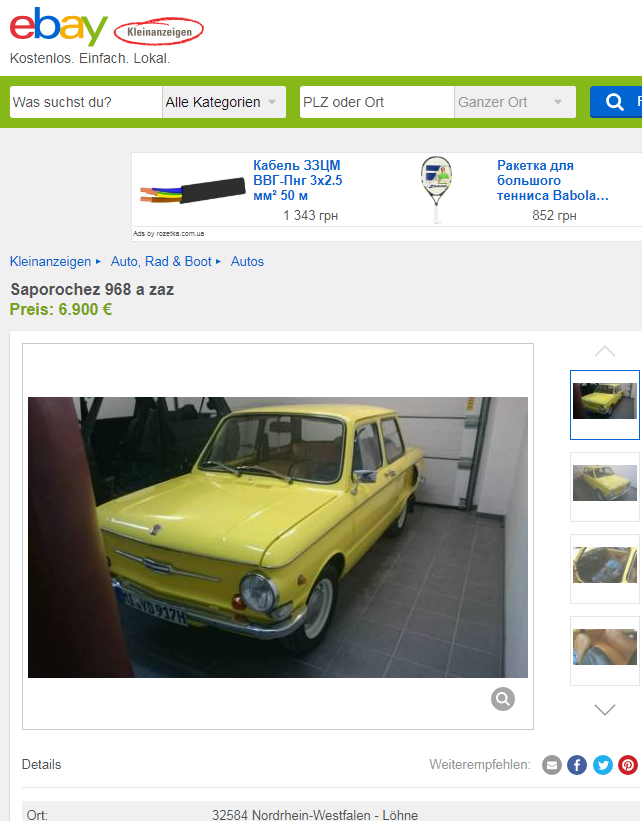 Объявление о продаже ЗАЗ-968 опубликовано на сайте eBay.