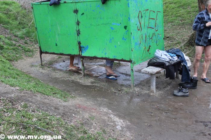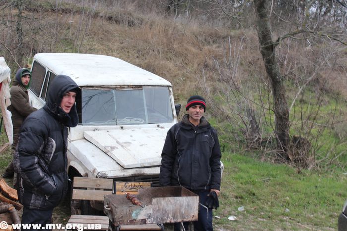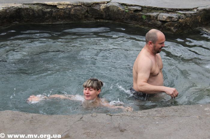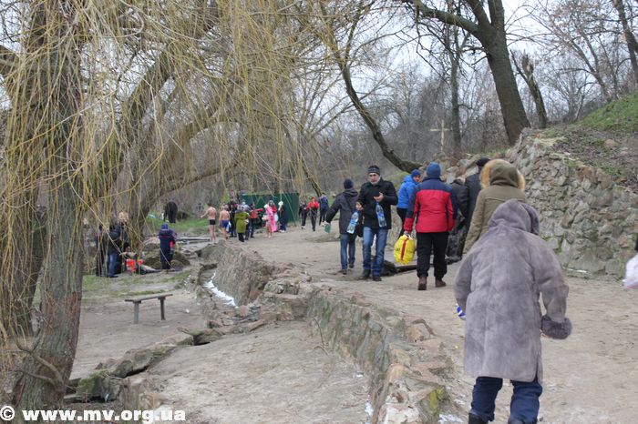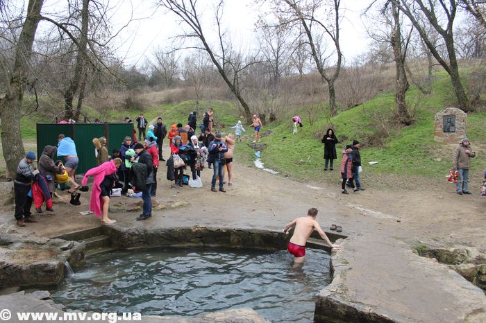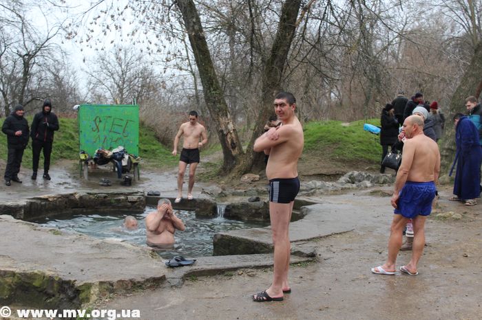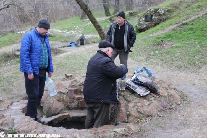 Хотя "движение" народа на родниках быстрое, но есть и люди подчеркнуто меланхоличные – вот поодаль стоят двое полицейских, а с другой стороны родников трое мужчин с надписью на спине «Рятувальник» похаживают среди людей. На отдаленных лавочках несколько чисто мужских компаний греются горячительными напитками. Снизу, с парковки машин, время от времени ветерок приносит запах шашлыка, который жарится на мангалах. Торговля едой и напитками идет очень бойко, так что один из продавцов шашлыка даже сворачивается – у него закончились и мясо, и дрова.