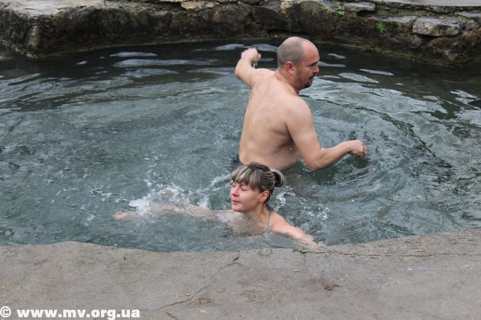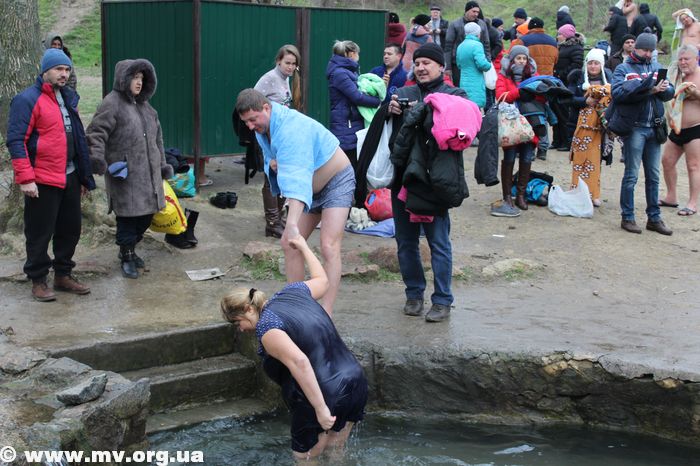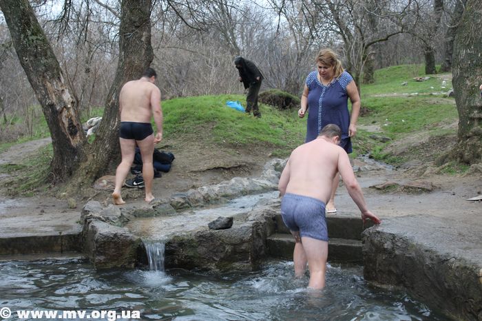 Десятки машин, сотни людей – к целебным источникам в Терпенье сегодня просто массовое паломничество. Одни окунаются в ледяную воду, другие стоят наготове с полотенцами, чтоб люди могли быстренько вытереться и одеться.