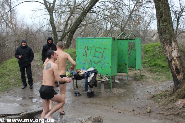 Тем временем в купель прыгает крупный мужчина, вызывая тем самым целое облако брызг. Люди, стоявшие слишком близко к воде, отскакивают назад, а его поступок побуждает пару колеблющихся все-таки пойти переодеваться.