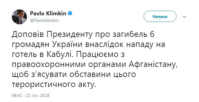 Министр иностранных дел Павел Климкин подтвердил гибель шести украинцев в результате нападения террористов на отель Intercontinental в столице Афганистана Кабуле. Об этом он сообщил в своем аккаунте в Twitter.