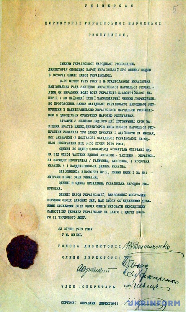 Универсал об Акте воссоединения с подписями Владимира Винниченко, Симона Петлюры и других членов Директории: