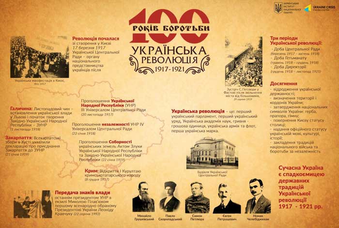 "Завершение Первой мировой войны увенчалось созданием на руинах империй ряда независимых национальных государств в Восточной Европе. Среди порабощенных народов, поднявшихся тогда на борьбу за независимость, были и украинцы, которые тоже сумели создать УНР и ЗУНР, а затем объединились в единое государство. Украина вторая после Финляндии провозгласила независимость на развалинах империй. Польша, Чехия, страны Балтии и Кавказа сделали это на несколько месяцев позже", - пишут историки УИНП, отмечая, что украинская независимость была провозглашена в условиях российской большевистской агрессии.