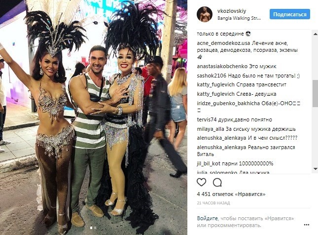Популярный украинский певец Виталий Козловский выложил на своей странице в Instagram пикантный снимок с так называемой «улицы разврата» в Таиланде. Именно там артист решил провести один из вечеров своего отпуска.