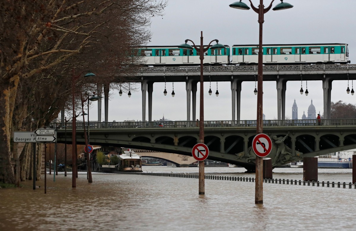 Сильные дожди в Париже вызвали резкое повышение уровня воды в реке Сена, в результате оказались затоплены улицы и железнодорожная линия.