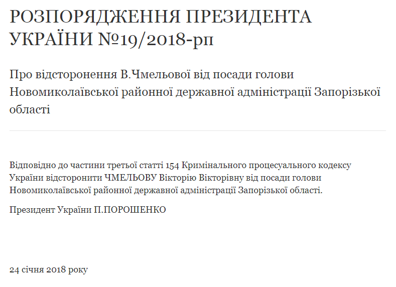 Своим распоряжением №19/2018-рп президент Украины Петр Порошенко отстранил от должности главу Новониколаевской районной государственной администрации Запорожской области Викторию Чмелеву.
