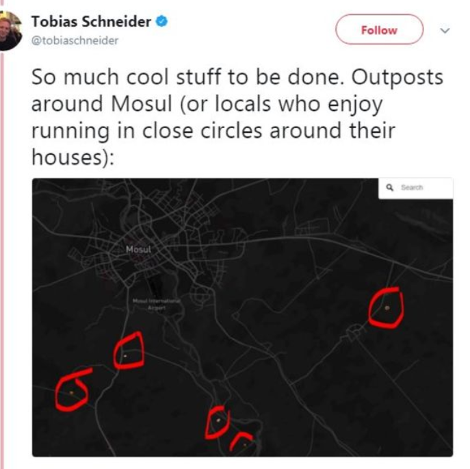 Аналитик Тобиас Шнайдер также указывает, что по следу фитнес-трекера легко узнается французская база Мадама в Нигере. На ней можно разглядеть и карту аванпостов вокруг сирийского Мосула.