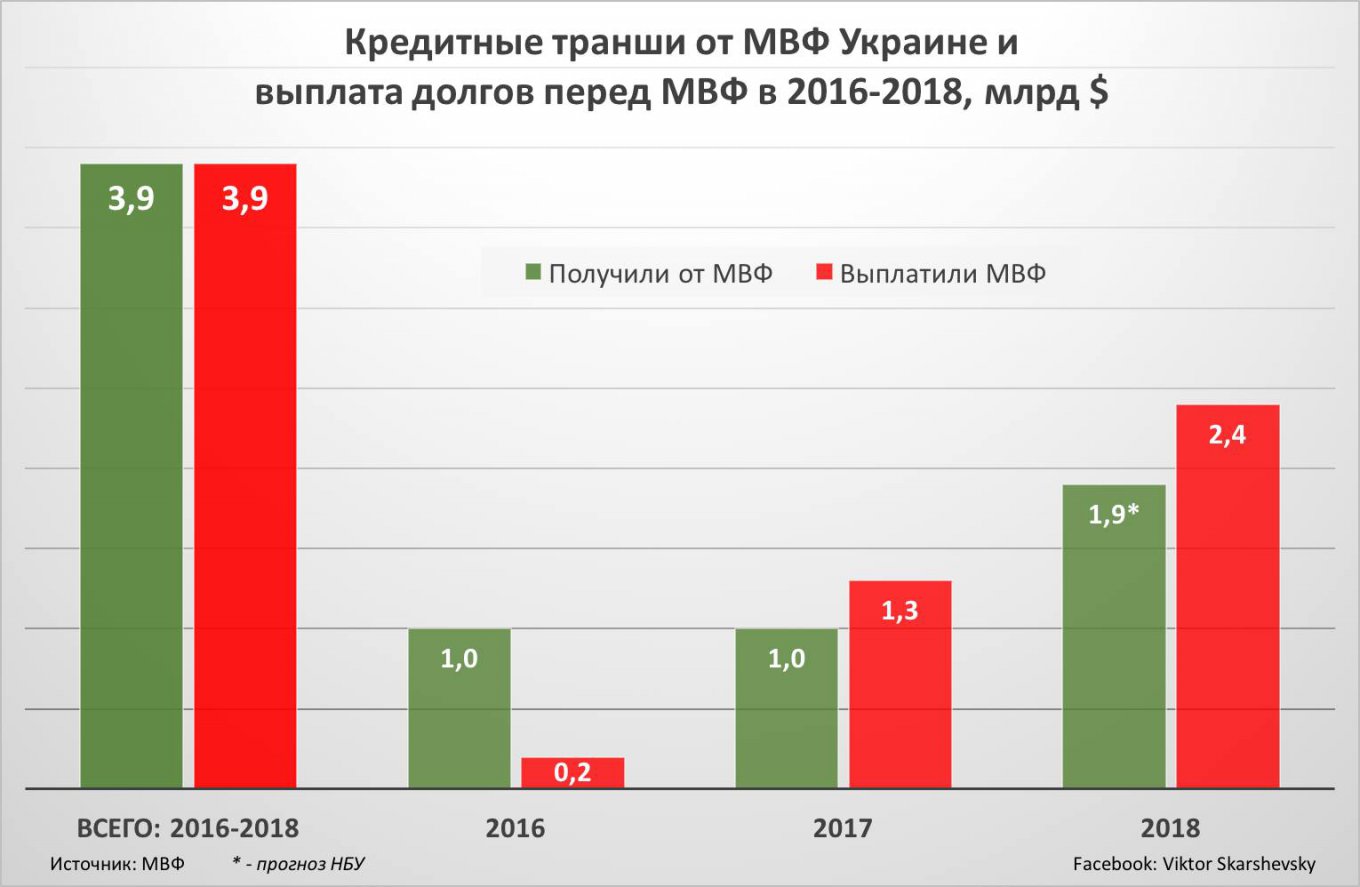 Если Украина в 2018 году таки получит широко разрекламированный Нацбанком, правительством и президентом транш от МВФ в сумме $1,9 млрд, то баланс сотрудничества Украины с МВФ в 2016-2018 годах будет выглядеть следующим образом: