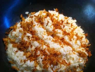 3. Добавить на сковороду полуготовый рис и примерно 50 мл воды и жарить около 10 минут, постоянно помешивая. По желанию можно добавить немного обжаренного лука.