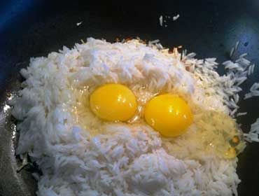 4. Добавить к рису сырые яйца, перемешать и готовить под крышкой примерно 10 минут.