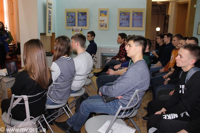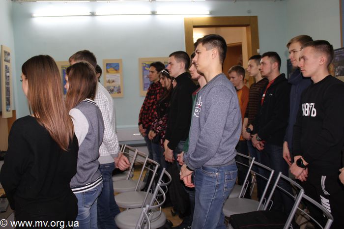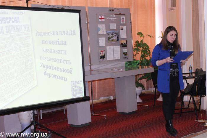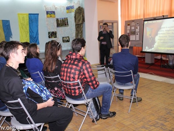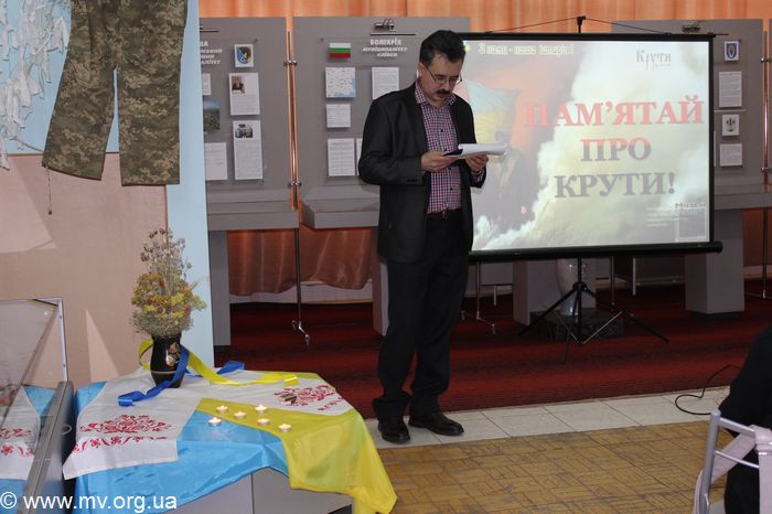 Научные сотрудники музея Александр Чухраенко и Наталья Твердохлеб рассказали студентам о трагических событиях января 1918 г. под станцией Круты, когда на защиту независимости молодой Украинской республики встала молодежь: студенты, гимназисты, члены студенческого куреня - ровесники нынешних молодых людей. Битву под Крутами нельзя назвать образцом военной стратегии и тактики. Но она стала символом патриотизма, героизма и преданности молодежи Украинской державе и национальной идее.