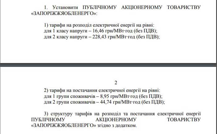 В рамках этого постановления тариф повысится для юридических лиц Запорожья и области, которых обслуживает «ЧАО «Запорожьеоблэнерго». Постановление с новыми тарифами вступает в свою силу 1 февраля этого года.
