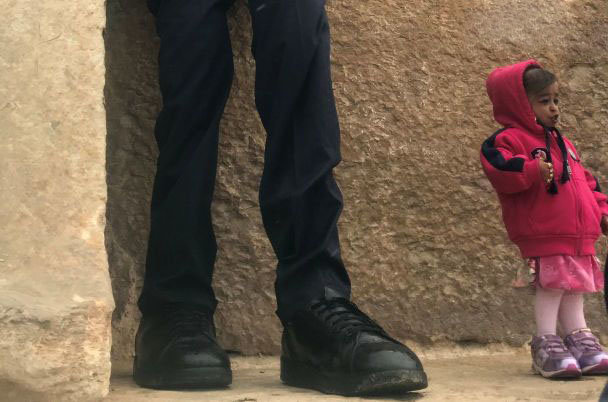 На фоне Султана Йоти, как младенец. Кажется, что женщина не больше, чем его ботинок.