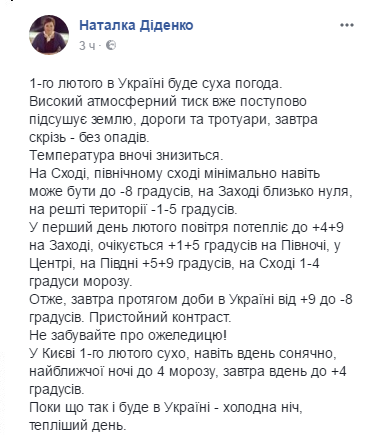 Такой прогноз на своей странице в Facebook дала синоптик Наталья Диденко.
