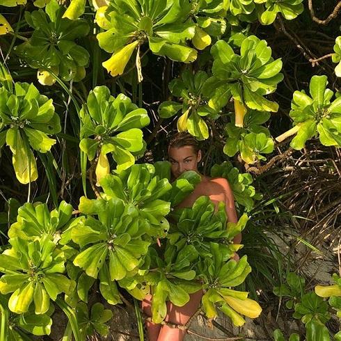 На этот раз балерина в костюме Евы прячется в кустах. Ее тело целомудренно прикрывают листья растения.