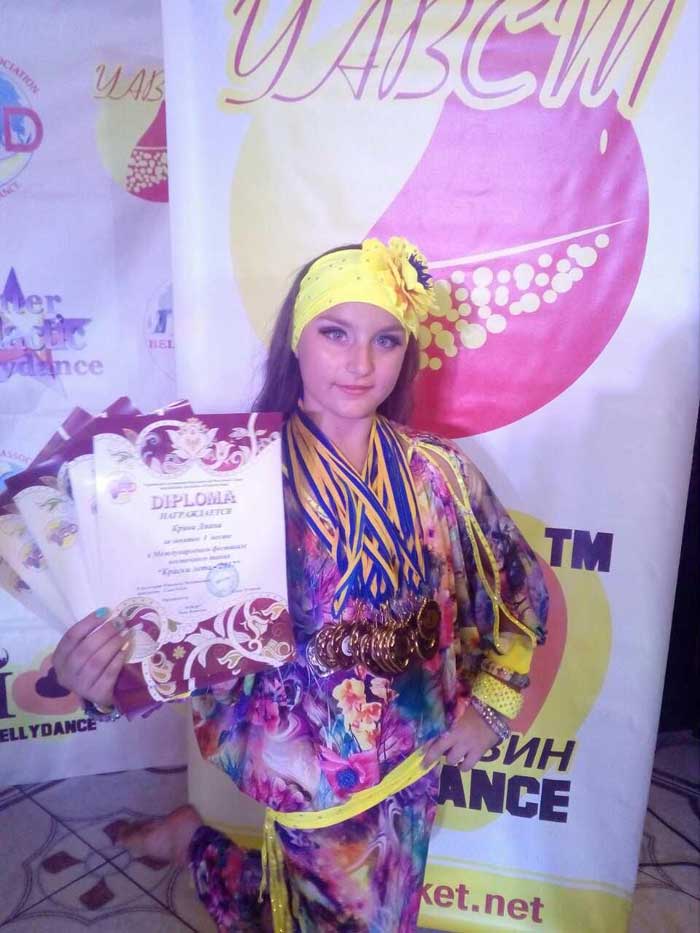 - Мелитополь представляли двое – 18-летняя Анастасия Семилуцкая и наша дочь, - говорит мама девочки Оксана. - Анастасия участвовала в лиге профессионалов, она привезла призовые места. Наша Диана стала лучшей в ювенальной открытой лиге. На конкурс собралось 400 человек из восьми стран – России, Украины, Молдовы, Литвы, Латвии, Беларуси, Словакии, Польши. Впервые Диана увлеклась восточными танцами в четырехлетнем возрасте, когда занималась в кружке при детском саду № 30. Музыкальный руководитель детсада Лариса Мироненко превращает занятия и утренники в настоящие восточные сказки. Сейчас Диана занимается в клубе AmiraDance (тренер Виктория Саварец). Тренер занимается с дочерью индивидуально, для начальной постановки танца требуется пять уроков, потом танец тщательно дорабатывается – «протанцовывается». Тренируется Диана основательно, на конкурсы ездит регулярно, дом украшен 170 медалями за победы.