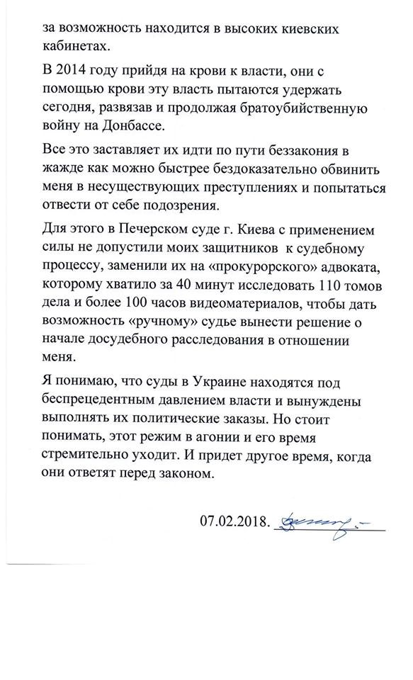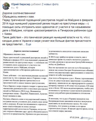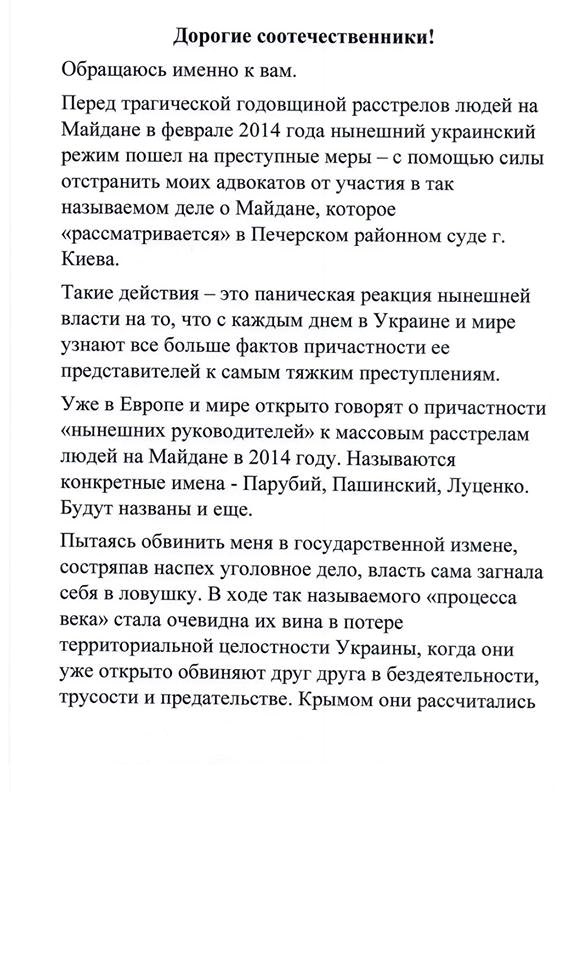 "Нынешний режим пошел на преступные меры - с помощью силы отстранить моих адвокатов от участия в так называемом деле о Майдане, которое рассматривается в Печерском районном суде г. Киева. Такие действия - это паническая реакция нынешней власти на то, что с каждым днем в Украине и мире узнают больше фактов причастности ее представителей к самым тяжким преступлениям", − отметил бывший президент в своем обращении.