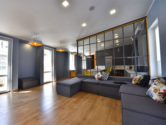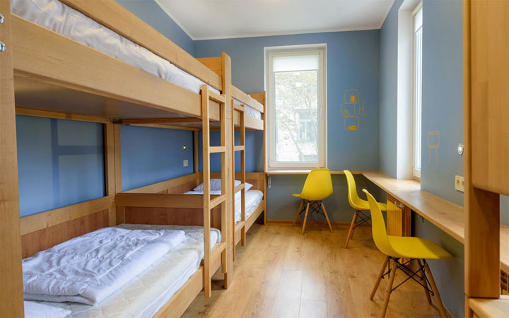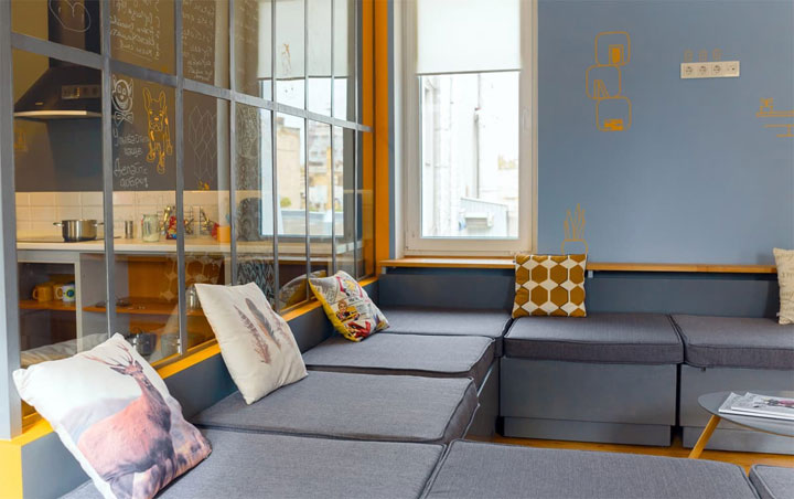 Дизайн интерьера - лофт, выполненный в мягкой серо-желтой гамме. Даже батареи номеров окрашены в сочный желтый цвет. В общих комнатах двухъярусные деревянные кровати и обязательно рабочие поверхности. Кухня оснащена барной стойкой, необходимой техникой, плитой. А за стеклянной перегородкой открывается уютное пространство: серые диваны, мягкие подоконники и журнальные столики.