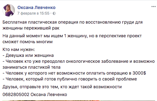 Волонтер Оксана Левченко на своей странице в Фейсбук опубликовала необычное объявление о бесплатной операции по восстановлению груди для девушки или женщины, перенесшей рак.