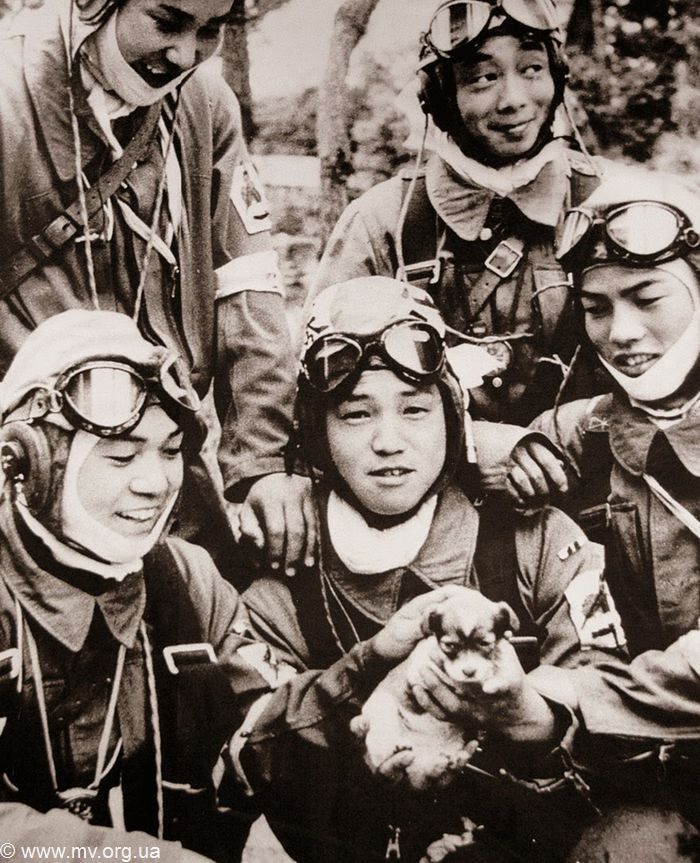 На первый взгляд кажется, что это совершенно обычный, ничем не примечательный снимок «на память», который делают военные курсанты. Но когда узнаешь, что это курсанты «школы камикадзе», то именно эта непримечательность повергает в настоящий ужас. 17-летний капрал Юкио Араки (на этом фото, сделанном 26 мая 1945 года, он держит щенка) отправился в свой последний полет уже на следующий день после того, как был сделан этот снимок пилотов 72-го дивизиона в Бансей, Кагосима.