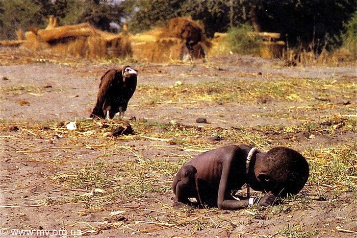 Эта жуткая фотография сделана Кевином Картером в 1993 году в суданском городе Айод. Родители ребенка побежали за едой к прибывшему с гуманитарной помощью самолету, а истощенная девочка потихоньку ползла вслед за ними, то и дело останавливаясь, чтобы передохнуть. За девочкой внимательно наблюдал гриф. Эти птицы не нападают на свою жертву, а предпочитают дождаться, когда все произойдет само собой. Кроме того, рядом находился фотограф, поэтому падальщику оставалось только ждать. Этот снимок принес Кевину Картеру славу, Пулитцеровскую премию и шквал обвинений в бесчеловечности. Всего через три месяца после вручения премии фотокорреспондент покончил с собой.