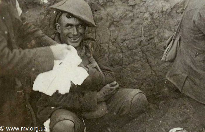 Этот снимок сделан во время боев у французской деревни Курселет в сентябре 1916 года. Человек на фото стал жертвой контузии, одним из многочисленных признаков которой являются расстройства психической деятельности. Подобный взгляд является последствием травмы и встречается при посттравматическом стрессе. Кроме того, стоит заметить, что в то время люди не улыбались на фотографиях.
