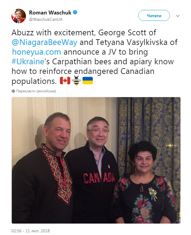 По словам посла Канады в Украине Романа Ващука, знания и умения украинских пасечников из "Всеукраинского братства пчеловодов Украины" и украинские пчелы помогут канадским пчеловодам преодолеть вызовы, стоящие перед канадской популяцией полезных насекомых.