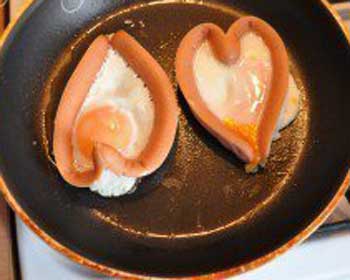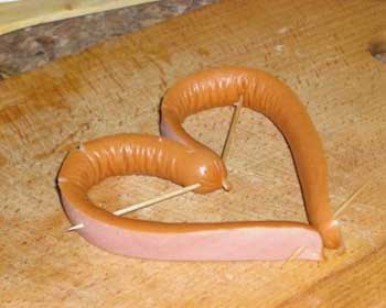 1. Сосиску разрезать вдоль, не до конца. Придать форму сердца и закрепить зубочисткой.