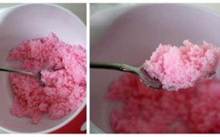 1. Высыпать в миску сахар, добавить воды и пищевой краситель. Все смешать в однородную массу. Не переборщите с водой, чтобы сахарный песок не стал растворяться. В итоге должна получиться влажная сахарная масса розового цвета (или любого другого по вашему желанию).