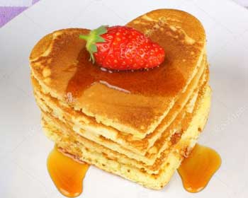 Чудесный завтрак, который задаст настроение всему дню. Сердечки можно вырезать уже из готовых оладьев или жарить их в форме в виде сердца.