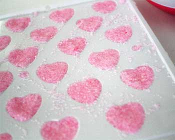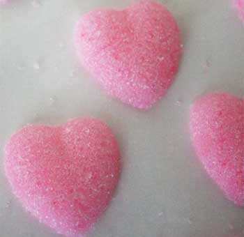 Понадобятся: силиконовая форма «сердечки», сахарный песок - 1 стакан, вода - 1 десертная ложка, пищевой краситель - розовый гель (можно купить в бакалейных отделах) или порошкообразный краситель, который нужно подготовить согласно инструкции на пакетике.