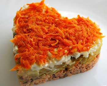 Ингредиенты для салата могут быть абсолютно разными, на ваше усмотрение. Главное. чтобы они сочетались друг с другом и легко укладывались слоями в формочку в виде сердца.