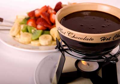 Способ приготовления: Растопить в фондюшнице шоколад на медленном огне. Добавить сгущенное молоко и немного ликера по вкусу. Нанизывать кусочки фруктов на десертные вилки. Есть, предварительно макая в шоколадную смесь.