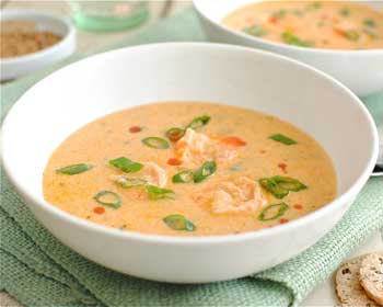2. Положить сельдерей, порошок карри и мускатный орех. Варить все на слабом огне в течение 20 минут. Процедить, вынуть сельдерей и протереть овощи и креветки сквозь сито или измельчить блендером.