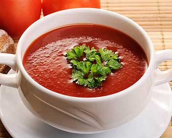 2. Помидоры опустить на несколько секунд в кипящую воду, после чего снять кожицу (можно взять помидоры, консервированные в собственном соку). Мелко нарезать, добавить овощной или куриный бульон и томатный сок. Если используются консервированные помидоры, сок можно взять из банки.
