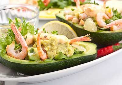 1. Отварные очищенные креветки нарезать кусочками. Авокадо разрезать пополам, удалить косточку, надрезать мякоть острым ножом крест-накрест и удалить ее, чтобы получились лодочки.