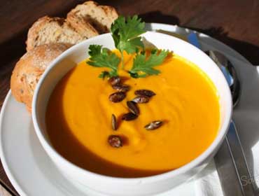 4. Суп разлить в тарелки, украсить тыквенными семечками и подать с гренками.