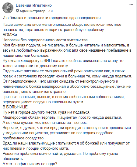 На проблему вновь обратила внимание жительница Мелитополя Евгения Игнатенко. В местной группе на Фейсбук она описала впечатления от лечения в первой горбольнице своей близкой подруги и выразила сожаление, что и городским властям, и обществу в целом плевать на столь серьезную проблему.