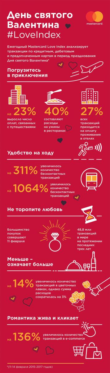 Ежегодный индекс Mastercard Love Index собирает информацию о транзакциях по платежным картам в период празднования Дня святого Валентина в течение последних трех лет (11-14 февраля 2015-2017). Индекс показал, что самая популярная статья расходов — ужин в ресторане — на него пришлось 40% трат и 75% транзакций в 2017 году.