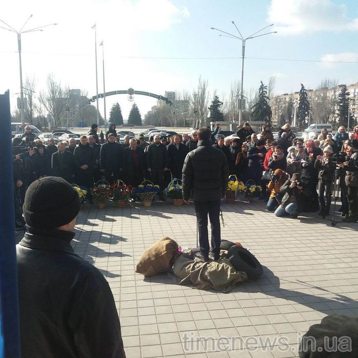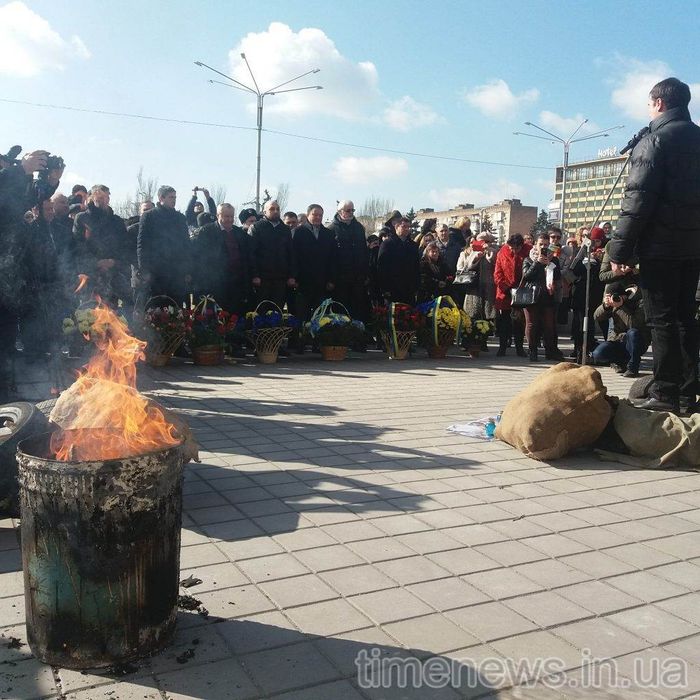 В память о событиях зимы 2013-2014 годов на главную площадь города принесли шины и разожгли костер в бочках. С импровизированного постамента между шинами и горящими бочками артисты прочитали стихи про Майдан.