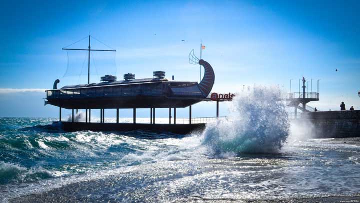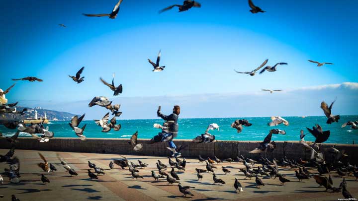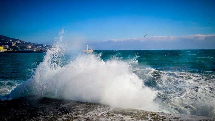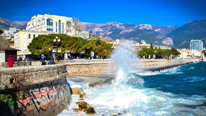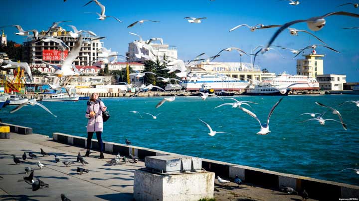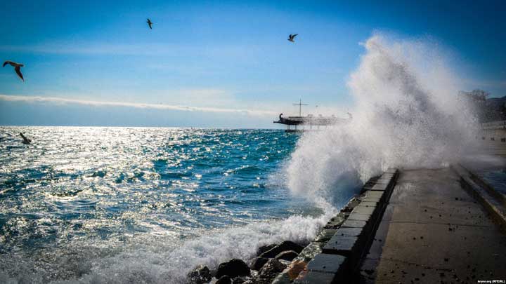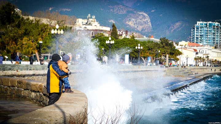 Среда, 21 февраля. Ялтинская набережная. Крымское управление МЧС России сообщает о шторме, который достигает 4 баллов. Тем не менее, светит привычное крымское зимнее солнце. А жители города, несмотря на шквальный ветер, неспешно прогуливаются на набережной и фотографируют бушующее море и птиц, которые сопротивляются стихии.