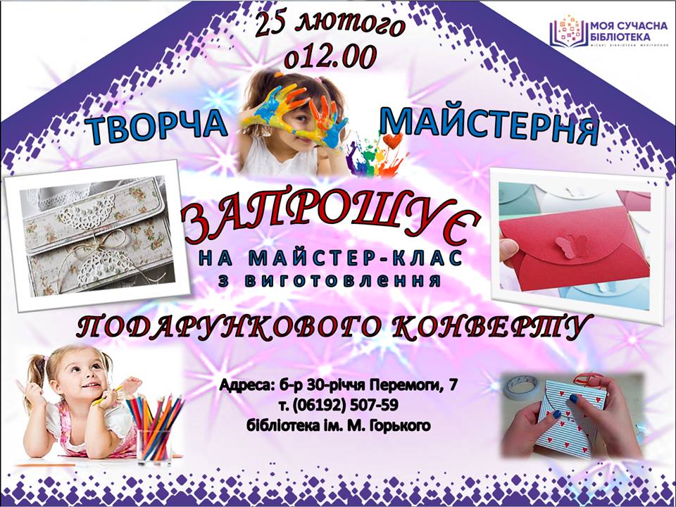 А вот в следующее воскресенье, 25 февраля, в творческой мастерской будет проведен бесплатный мастер-класс по изготовлению подарочных конвертов. Библиотекари приглашают всех желающих провести время интересно, познавательно и с пользой. Адрес библиотеки им. М. Горького: б-р 30 лет Победы, 7, тел. (06192) 5-07-59. Приходите, занятия начинаются в 12.00.