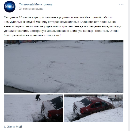 К счастью люди смогли увернуться от машины. Сам автомобиль оказался в канаве. Его водитель был трезв. Авария произошла из-за плохой работы коммунальных служб, - считает автор поста.