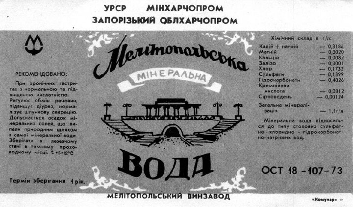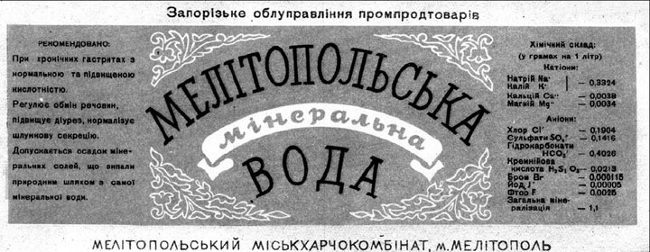 Такая настойчивость принесла, наконец, плоды. В феврале 1955 года институт прислал «Данные исследования образца воды скважины № 9 г. Мелитополя». Проведя химическое исследование доставленных пяти литров, специалисты установили, что содержание солей в воде невелико (около 1 г/л), она относится к группе гидро-карбонатно-хлоридно-натриевых минеральных вод со значительным содержанием сульфатов. Отмечена характерная особенность воды: в ней есть биологически активные микроэлементы: медь, фтор, бром, йод, кремневая кислота, метаборная кислота, незначительное количество органических - гуминовых веществ. Анализы 1952-1954 годов показали, что вода сохраняет стабильный состав. В санитарно-бактериологическом отношении она очень чистая. Вывод медиков гласил: вода показана к лечебному применению при заболеваниях желудка - хронических гастритах с повышенной кислотностью. Воду целесообразно использовать также как питьевую.
